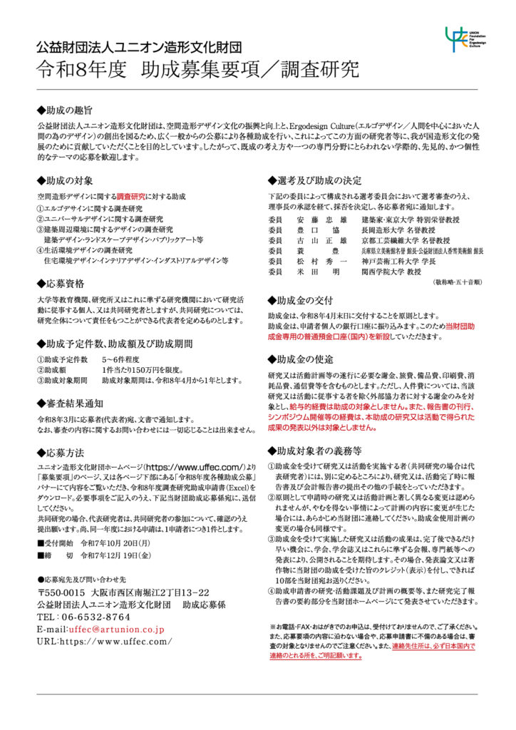 (2026年)令和8年度 助成募集要項/調査研究 助成募集要項/調査研究 (クリックすると拡大画像をご覧いただけます。) DOWNLOAD 「令和8年度調査研究助成申請書.xlsx」をダウンロードしていただき、必要事項を記入の上、送信ください。